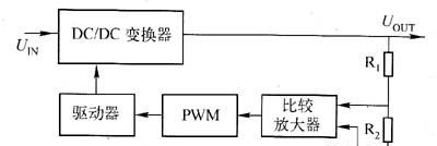其中DC/DC變換器用以進行功率轉換,它是電源適配器的核心部分,此外還有啟動、過流與過壓保護、噪聲濾波等電路?輸出采樣電路(R1?R2)檢測輸出電壓變化,并與基準電壓U,比較誤差電壓經(jīng)過放大及脈寬調制(PWM)電路,再經(jīng)過驅動電路控制功率器件的占空比,從而達到調整輸出電壓大小的目的。