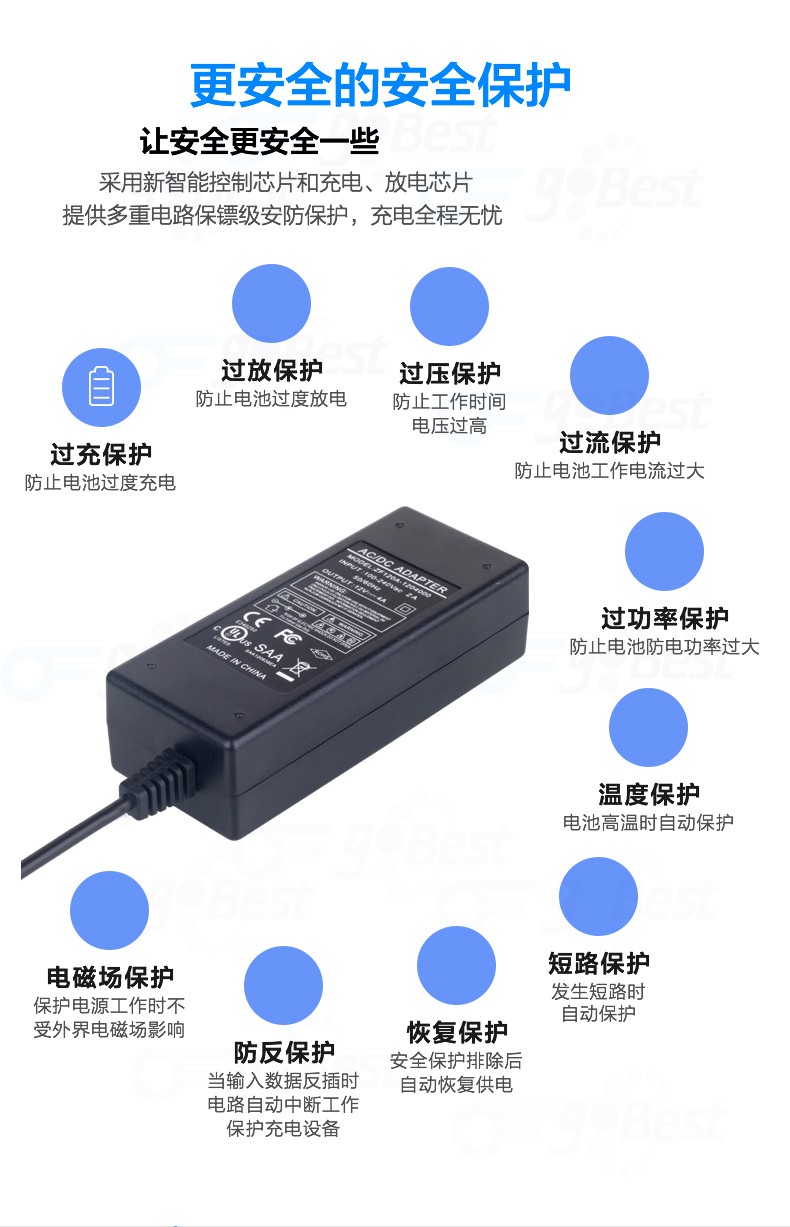• 采用前沿IC控制方案和先進(jìn)的制造工藝,高精度,低噪音;過壓,過流,過充,短路等多重保護(hù)。
