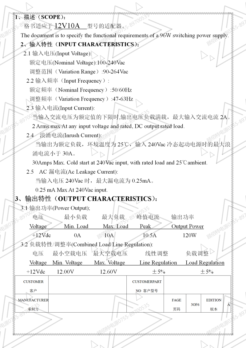 12V10A電源適配器規(guī)格書