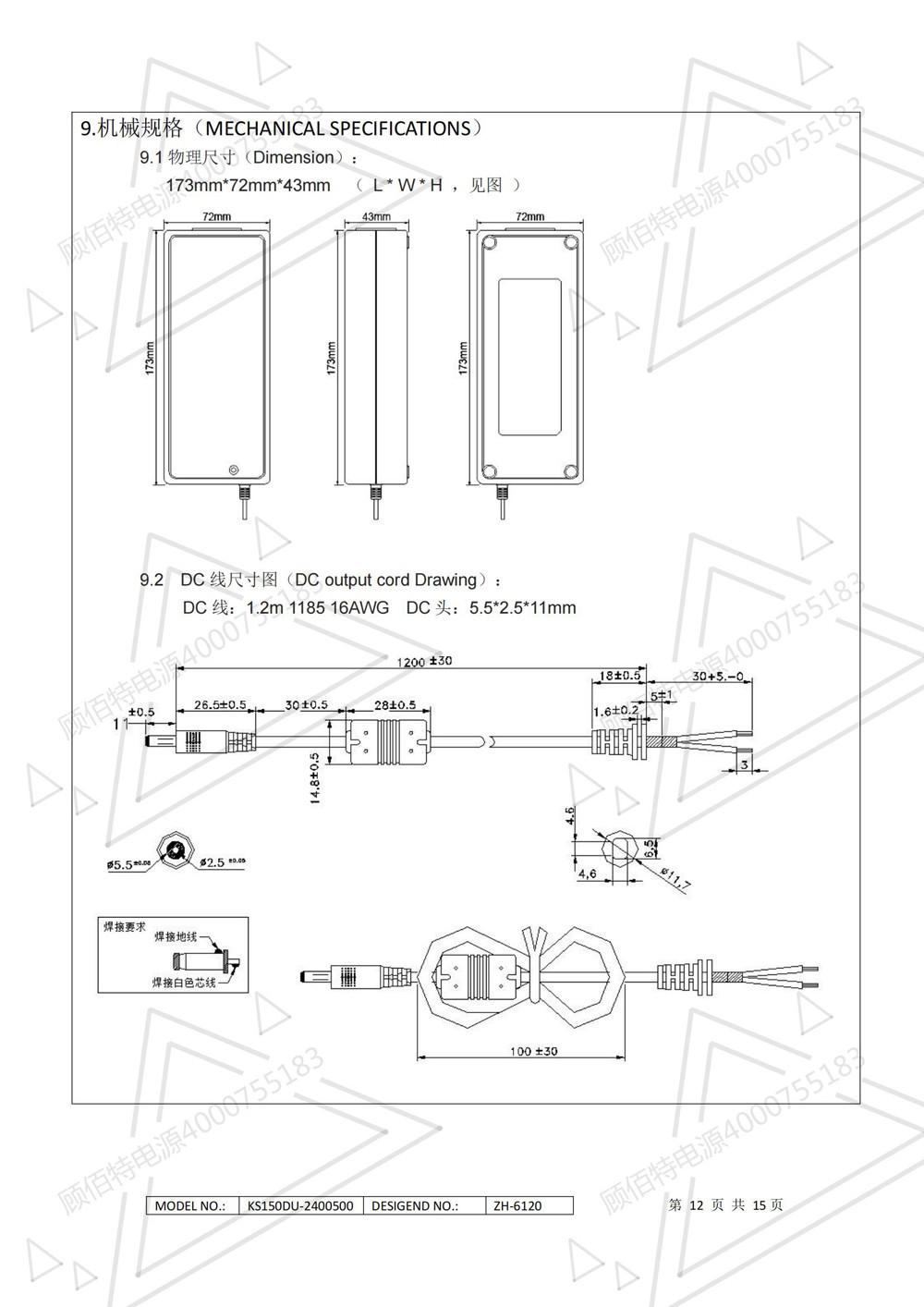 24V5A電源適配器規(guī)格書資料詳細(xì)描述了一款120W(連續(xù)輸出功率)開關(guān)電源的電氣性,結(jié)構(gòu)性及環(huán)境等要求。